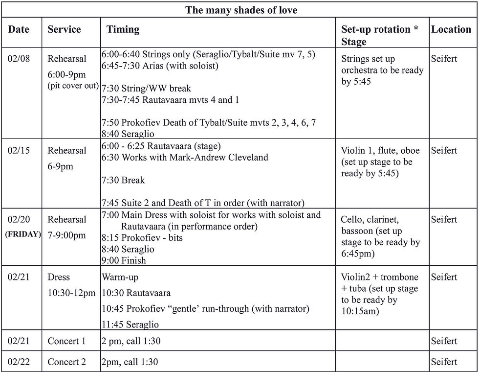 Rehearsal space opens to Orchestra at 6:00 PM for set up unless otherwise noted below.
